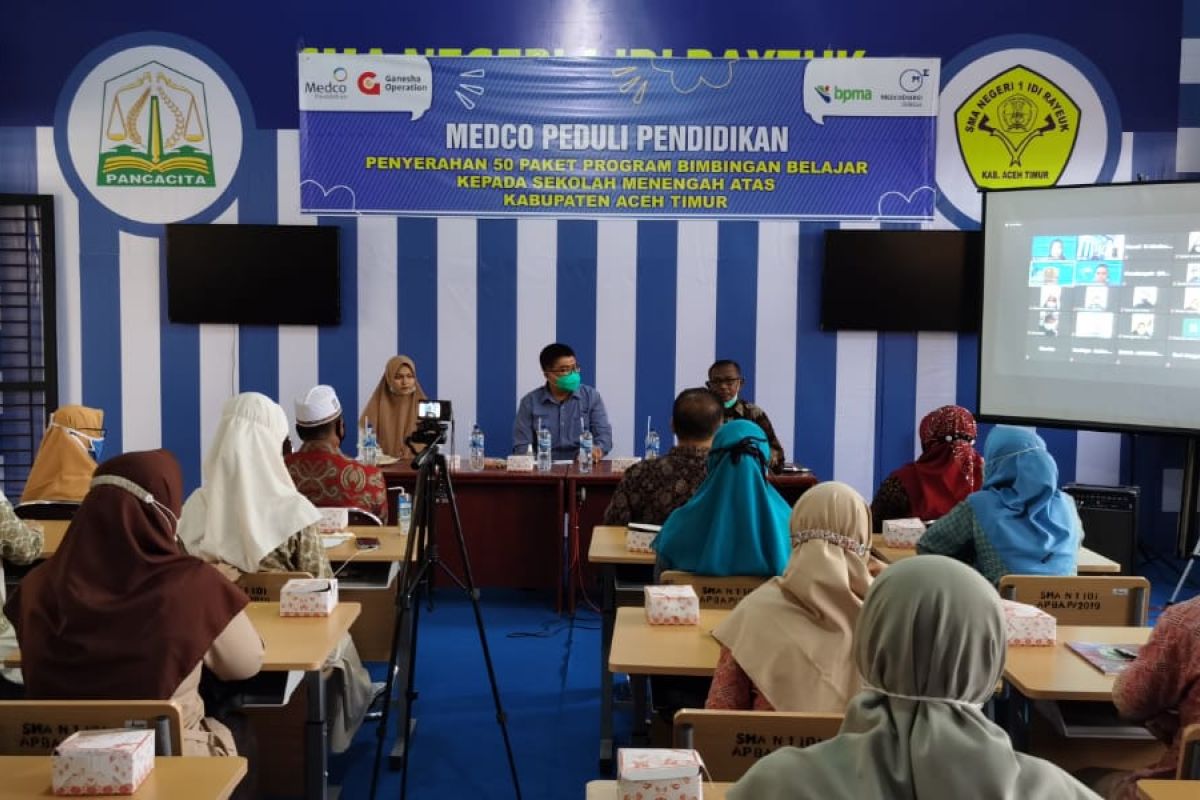 Pekerja dan Manajemen Medco Grup menggelar bimbingan belajar secara daring untuk para siswa Sekolah Menengah Atas di Aceh Timur dalam upaya menghadapi ujian Seleksi Bersama Masuk Perguruan Tinggi Negeri (SBMPTN) 2021.