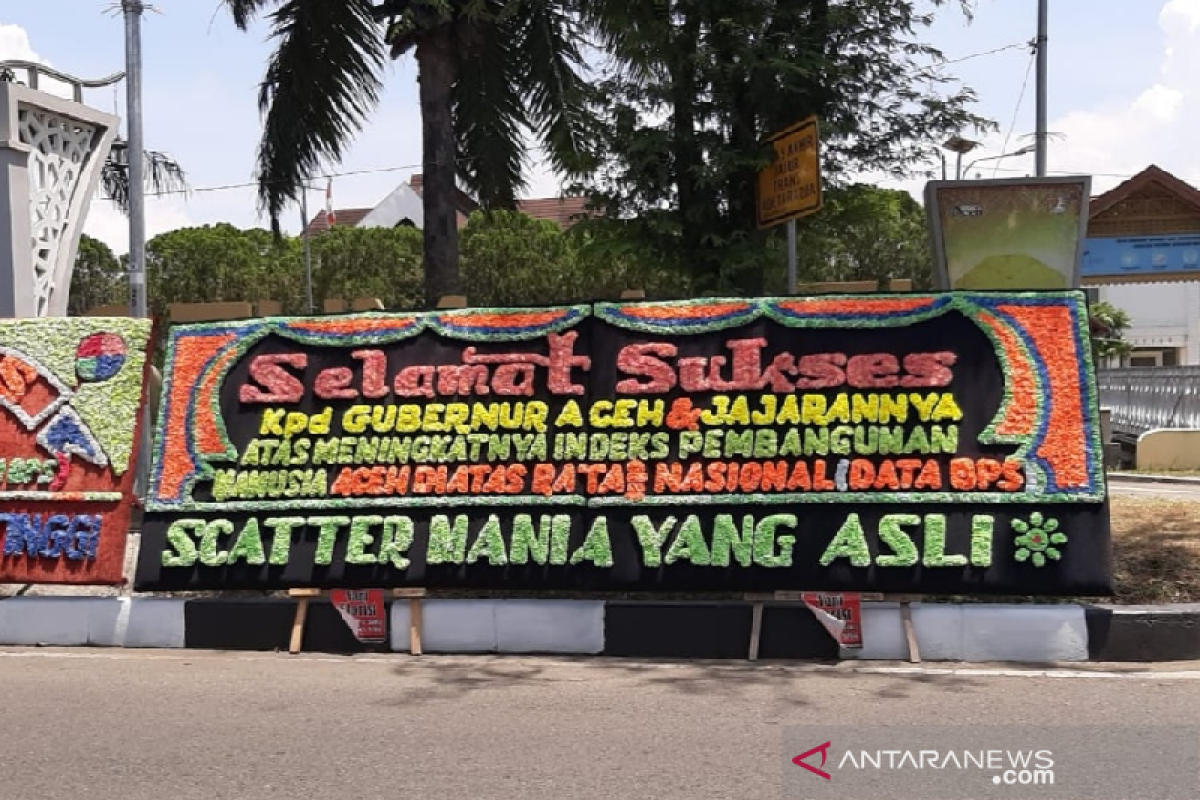Tulisan pada papan bunga itu yakni ucapan selamat sukses kepada Gubernur Aceh dan jajarannya ats meningkatnya indeks pembangunan manusia Aceh di atas rata-rata nasional.