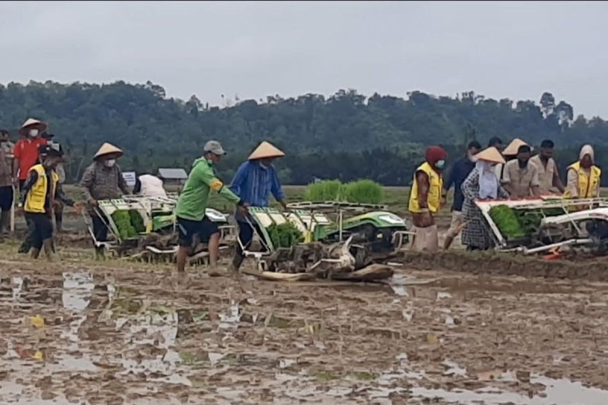 Proses penanaman padi klaster IP 300 di Desa Paya Meuligo, Kecamatan Peureulak, Aceh Timur, Kamis (10/6/2021). Antara Aceh/HO