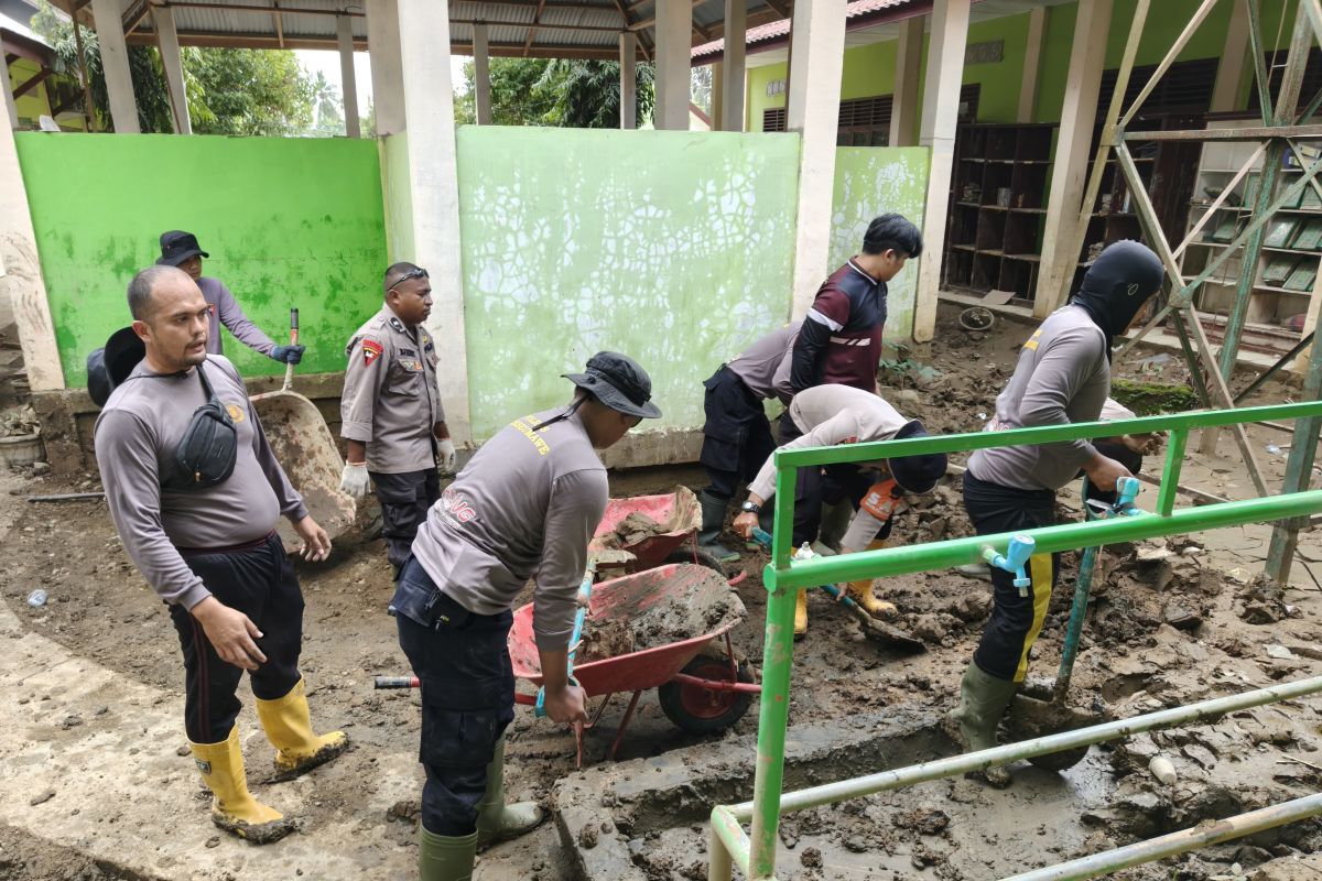 Banda Aceh (ANTARA) - Personel Polres Lhokseumawe bersama BKO Brimob Polda Kalimantan Timur (Kaltim) bergotong royong membersihkan lingkungan MTsN 10 di Gampong Teungoh, Kecamatan Sawang, Kabupaten Aceh Utara yang terdampak banjir.