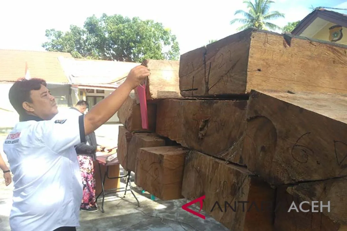 Petugas mengamankan delapan kubik kayu balok tem di halaman Mapolsek Mereubo, Aceh Barat, Kamis, (8/11/2018) (Antara Aceh/ Anwar)