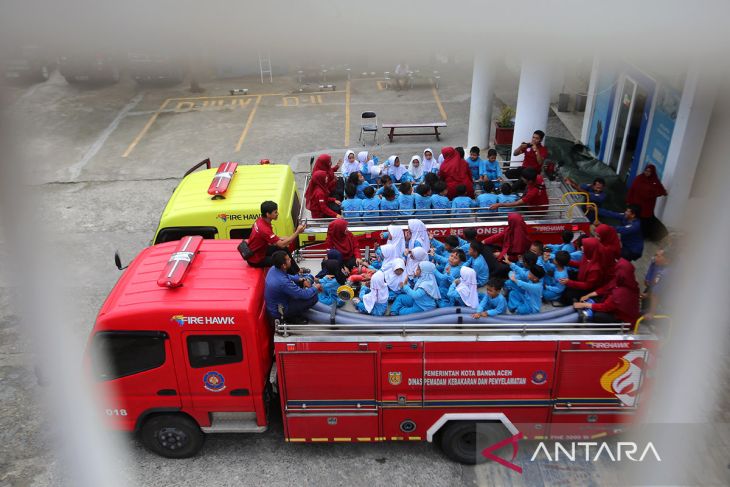 Petugas pemadam bersama guru mendampingi murid TK Ruman Aceh menaiki mobil pemadam saat edukasi pengenalan alat pemadam kebakaran di Banda Aceh, Aceh, Selasa (17/6/2025). Kegiatan tersebut untuk memperkenalkan fungsi peralatan pemadam kebakaran dan selain mensosialisasikan kepada anak sekolah tentang bahaya bermain api yang dapat menyebabkan kebakaran rumah dan bangunan lainnya. ANTARA FOTO/Ampelsa.