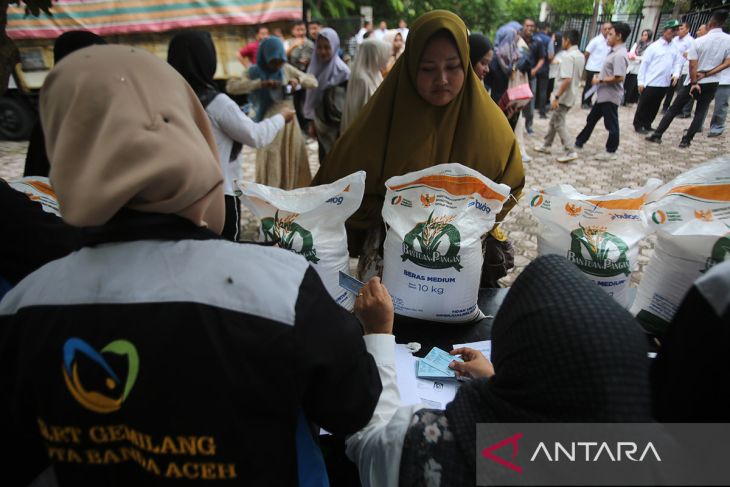 Petugas melakukan perekaman data terhadap Keluarga Penerima Manfaat (KPM) saat berlangsung penyaluran bantuan pangan beras di kantor Camat Lueng Bata, Banda Aceh, Aceh, Rabu (16/7/2025). Badan Pangan Nasional menargetkan sebanyak 18,27 juta Penerima Bantuan Pangan (PBP) untuk alokasi Juni dan Juli 2025 dengan total penyaluran beras sebanyak 20 kg atau 10 kg per bulan per KPM guna membantu perekonomian masyarakat kurang mampu. ANTARAFOTO/Ampelsa.