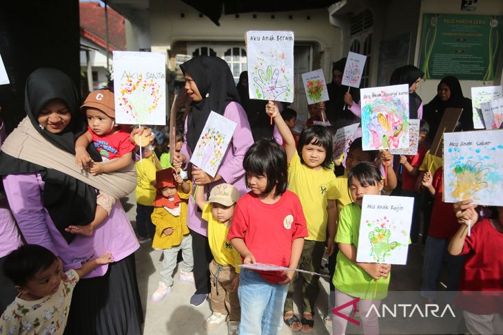 Murid Pendidikan Anak Usia Dini (PAUD) dan murid Taman Kanak kanak (TK) bersama gurunya membawa poster berjalan kaki saat menggelar karnaval di lingkungan Sekolah Harsya Ceria, Banda Aceh, Aceh, Kamis (24/7/2025). Sekolah Harsya Ceria yang merupakan sekolah inklusi perpaduan pendidikan reguler dan pendidikan anak berkebutuhan khusus di daerah itu memperingati Hari Anak Nasional (HAN) dengan kegiatan karnaval membawa poster yang bertuliskan , Anak Rajin, Anak Hebat, Anak Disiplin dan Anak Ceria untuk Indonesia Kuat Menuju Indonesia Emas. ANTARA FOTO/Ampelsa.