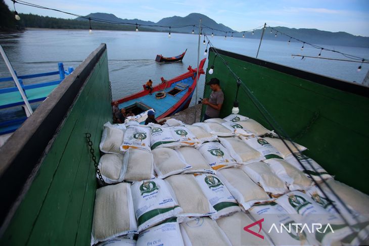 Pekerja memuat bantuan pangan beras ke kapal nelayan di pelabuhan lama penyeberangan Ulee Lheue, Banda Aceh, Aceh, Senin (28/7/2025).Perum Bulog Aceh mengapalkan bantuan pangan beras sebanyak 13 ton menggunanakan kapal nelayan ke wilayah terluar kecamatan Pulau Aceh, kabupaten Aceh Besar, untuk disalurkan kepada sebanyak 667 Penerima Bantuan Pangan (PBP) yang tersebar di 17 gampong (desa) periode Juni dan Juli 2025. ANTARA FOTO/Ampelsa.