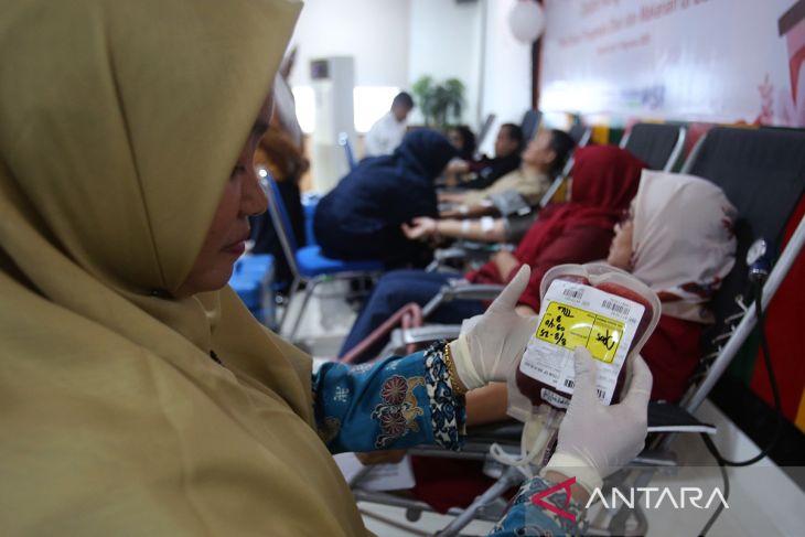 Petugas Unit Transfusi Darah (UTD) Palang Merah Indonesia Aceh mengambil darah pendonor di Balai Besar Pengawas Obat dan Makanan (BBPOM ) Banda Aceh, Aceh, Jumat (8/8/2025). Aksi sosial donor darah bagi masyarakat umum dan ASN untuk pemenuhan kebutuhan darah yang di gelar pemerintah provinsi Aceh bersama BBPOM dan PMI Aceh itu dalam alam rangka menyambut Hari Ulang Tahun (HUT) ke 80 Republik Indonesia. ANTARA FOTO/Ampelsa.