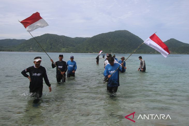 Komunitas Mancing Aceh berbaris membawa bendera untuk dikibarkan di perairan Pulau Tuan, desa Lamteungoh, kecamatan Peukan Bada, kabupaten Aceh Besar, Aceh, Minggu (10/8/2025). Pengibaran bendera di Pulau Tuan yang memiliki keindahan wisata bawah laut ,terumbu karang dan berbagai jenis ikan hias di daerah tersebut dalam rangka menyambut HUT ke 80 Republik Indonesia. ANTARA FOTO/Ampelsa.