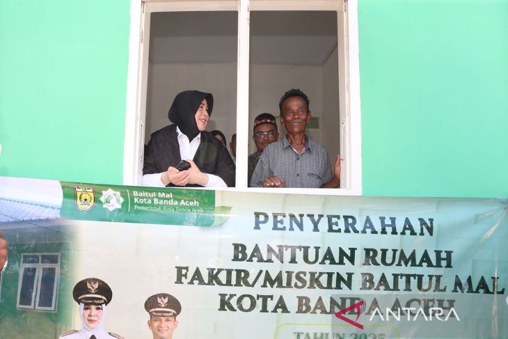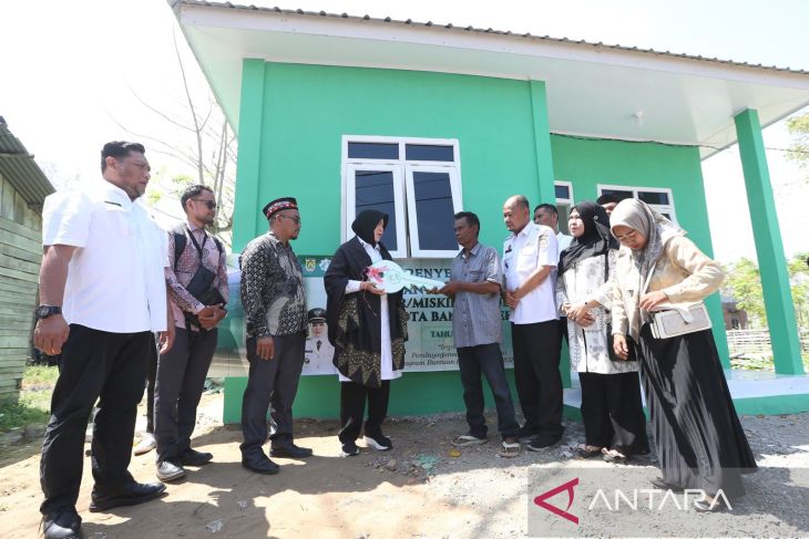 Wali Kota Banda Aceh Illiza Sa’aduddin Djamal secara simbolis menyerahkan kunci rumah kepada penerima manfaat program perumahan Baitul Mal di Desa Alue Naga, Banda Aceh, Rabu (11/3/2026). Baitul Mal Kota Banda Aceh membangun 30 unit rumah layak huni yang tersebar di sembilan kecamatan dengan dana zakat, infak, dan sedekah (ZIS) pada tahun 2025 untuk meningkatkan taraf hidup keluarga kurang mampu. ANTARA FOTO/Irwansyah Putra