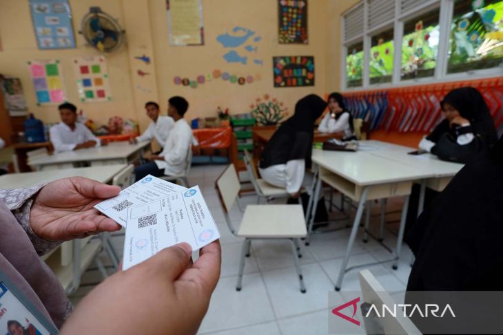 Petugas memeriksa kartu ujian peserta pendidikan kesetaraan Paket C sebelum pelaksanaan ujian di SDN 18 Banda Aceh, Aceh, Rabu (29/4/2026). Sebanyak 317 peserta dari kalangan alumni pondok pesantren tradisional serta masyarakat kurang mampu yang tidak memperoleh pendidikan formal mengikuti ujian Paket C tahun ajaran 2025/2026 dilaksanakan secara gratis sebagai upaya mendukung program pendidikan nasional. ANTARA FOTO/Akramul Muslim