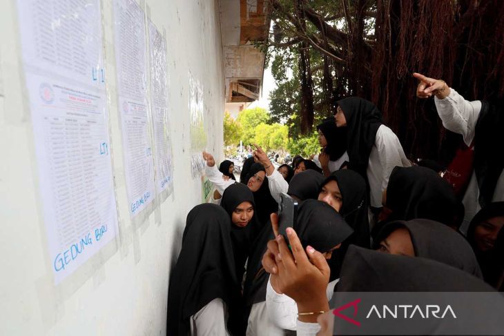 Sejumlah peserta mencari informasi ruang ujian pendidikan kesetaraan Paket C yang diselenggarakan oleh Pusat Kegiatan Belajar Masyarakat (PKBM) Ruman Aceh di SDN 18 Banda Aceh, Aceh, Rabu (29/4/2026). Sebanyak 317 peserta dari kalangan alumni pondok pesantren tradisional serta masyarakat kurang mampu yang tidak memperoleh pendidikan formal mengikuti ujian Paket C tahun ajaran 2025/2026 dilaksanakan secara gratis sebagai upaya mendukung program pendidikan nasional. ANTARA FOTO/Akramul Muslim