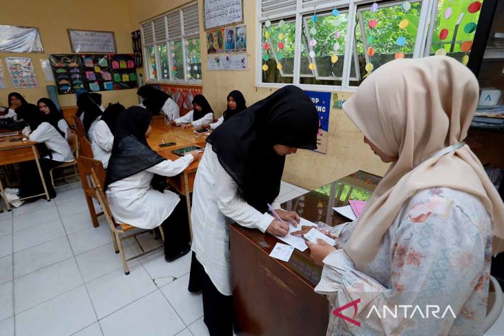 Peserta menandatangani daftar hadir sebelum mengikuti ujian pendidikan kesetaraan Paket C yang diselenggarakan oleh Pusat Kegiatan Belajar Masyarakat (PKBM) Ruman Aceh di SDN 18 Banda Aceh, Aceh, Rabu (29/4/2026). Sebanyak 317 peserta dari kalangan alumni pondok pesantren tradisional serta masyarakat kurang mampu yang tidak memperoleh pendidikan formal mengikuti ujian Paket C tahun ajaran 2025/2026 dilaksanakan secara gratis sebagai upaya mendukung program pendidikan nasional. ANTARA FOTO/Akramul Muslim