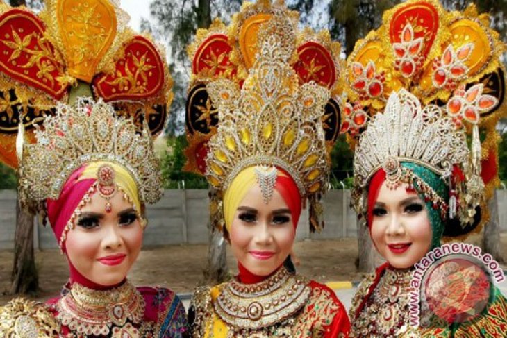 Tiga Putri Aceh mengenakan pakaian adat tradisional Aceh berpose untuk wartawan usai menyambut kedatangan Presiden Republik Indonesia Joko Widodo di Kota Lhokseumawe, Provinsi Aceh, Kamis (2/6). Putri Aceh yang dinobatkan sebagai Putri Adat itu direkrut dari kalangan remaja yang memiliki kemampuan seni, paham tradisi dan adat istiadat untuk menyambut tamu kehormatan daerah. ANTARA FOTO/Rahmad/pd/16