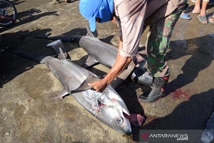 Nelayan memotong sirip ikan hiu ekor panjang atau Hiu Thresher Shark (Alopias Macrourus) di pelabuhan Perikanan Samudera Lampulo, Banda Aceh, Rabu (13/6/2019). Penangkapan ikan hiu di daerah itu masih terus berlangsung, meski pemerintah sudah melakukan sosialisasi dan larang untuk menangkap jenis hiu tertentu yang dilindungi. (Antara Aceh/Ampelsa)